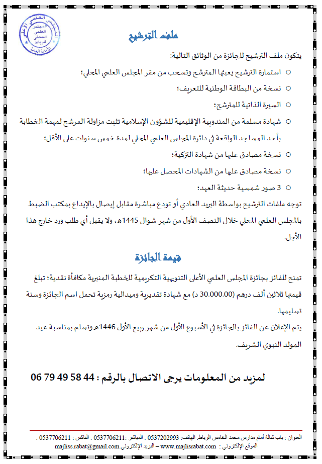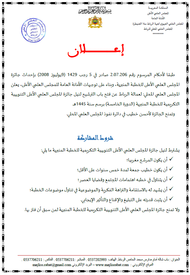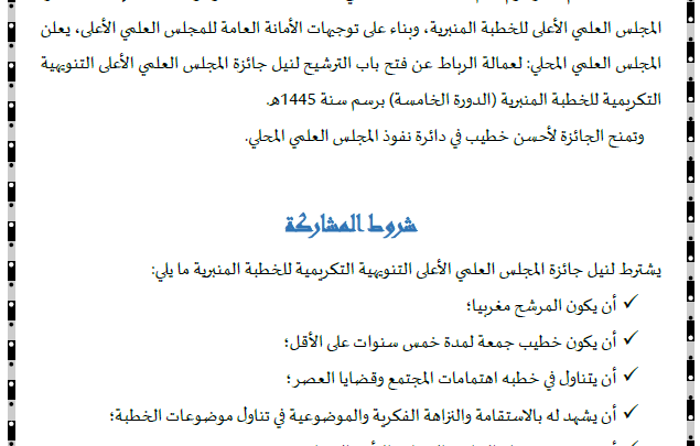 الرئيسية/المجلس العلمي/الإعلان عن الترشيح لنيل جائزة المجلس العلمي الأعلى التنويهية التكريمية للخطبة المنبرية الدورة الخامسة برسم سنة 1445هـ المجلس العلمي أخر الأخبار الإعلان عن الترشيح لنيل جائزة المجلس العلمي الأعلى التنويهية التكريمية للخطبة المنبرية الدورة الخامسة برسم سنة 1445هـ admin 4 أبريل 2024 109 أقل من دقيقة اظهر المزيد